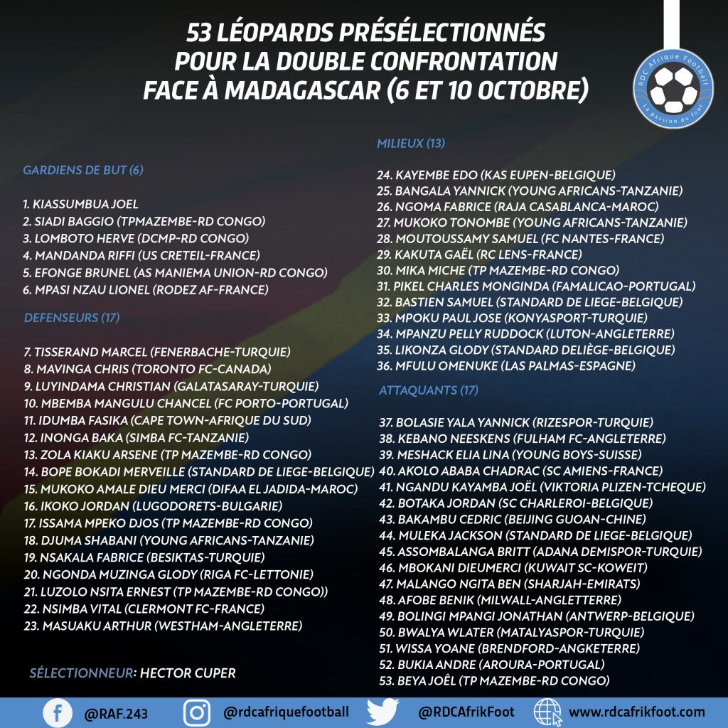 À quelques semaines de la double confrontation tant attendu de la RDC face à Madagascar ce 6 et 10 octobre dans le cadre de la 3e et 4e journée des éliminatoires de la coupe du monde Qatar 2022, Hector Cuper le sélectionneur national des léopards de la RDC, a rendu public ce lundi 13 septembre, une liste des 53 léopards présélectionnés.