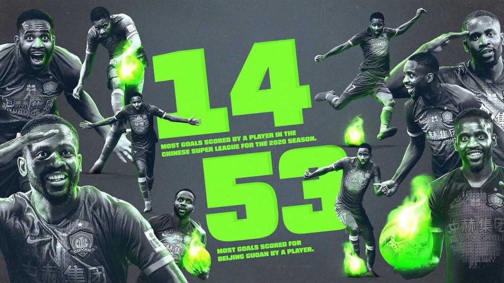Cependant, celui que les Congolais surnomment “BAKAGOAL” a attendu deux nouvelles saisons pour entrer dans l’histoire du club, en finissant meilleur buteur du championnat chinois en 2020 (14 buts) pour la première fois depuis son arrivé au championnat chinois, et en devenant ainsi le meilleur buteur de l’histoire du Beijing Guoan (53-58 buts).
