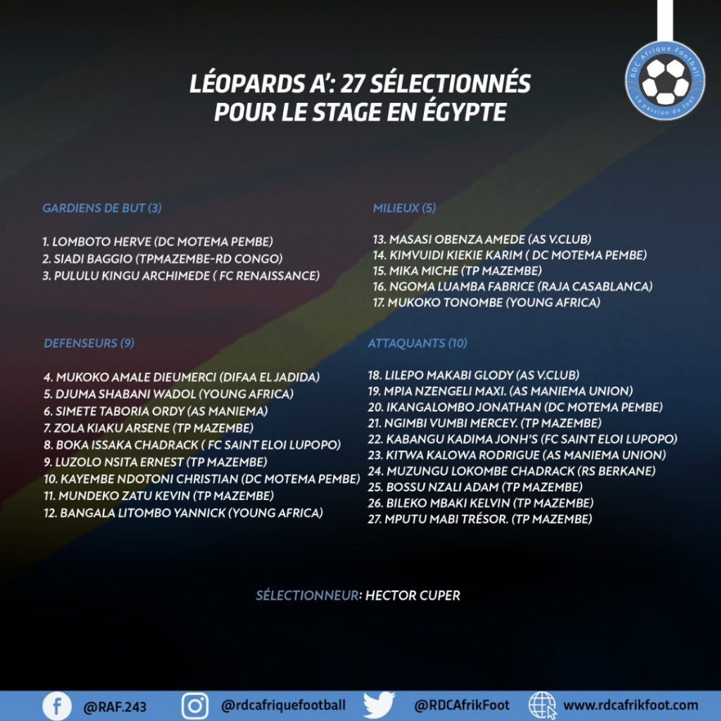 Les léopards A’ affronteront deux clubs égyptiens; Pyramide FC le 05 janvier et FC Zed le 08 janvier.