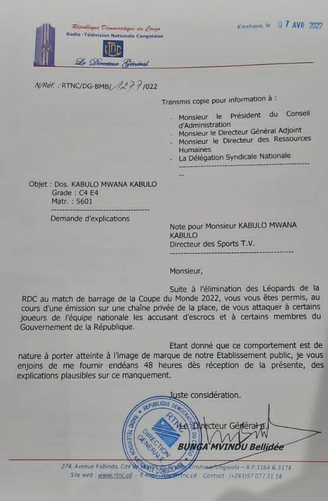 Par conséquent, la direction générale de la chaîne nationale a en date du 7 avril, adressé une demande d’explication à Mr François Kabulo, concernant ses propos qui a effrayé l’opinion sportive.