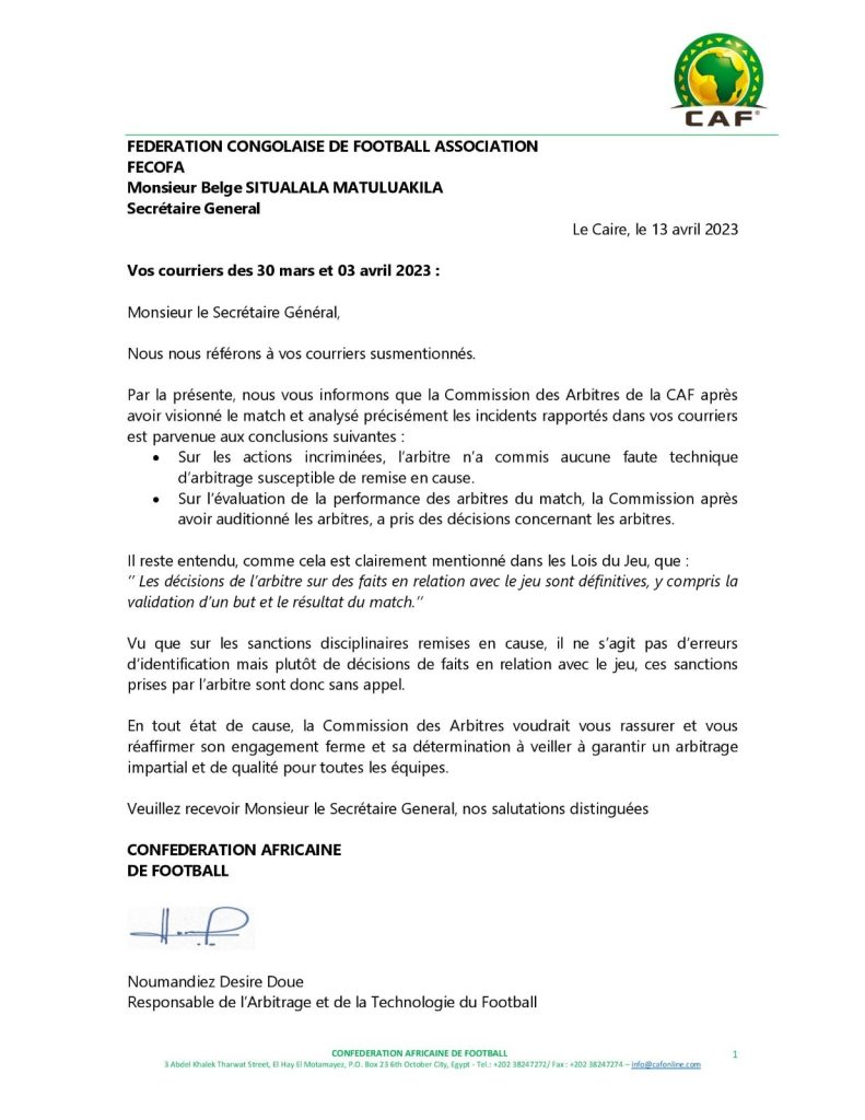 ‘’Les décisions de l’arbitre sur des faits en relation avec le jeu sont définitives, y compris la validation d’un but et le résultat du match.’’ Précise la CAF dans sa réponse à la FECOFA du 13 avril.