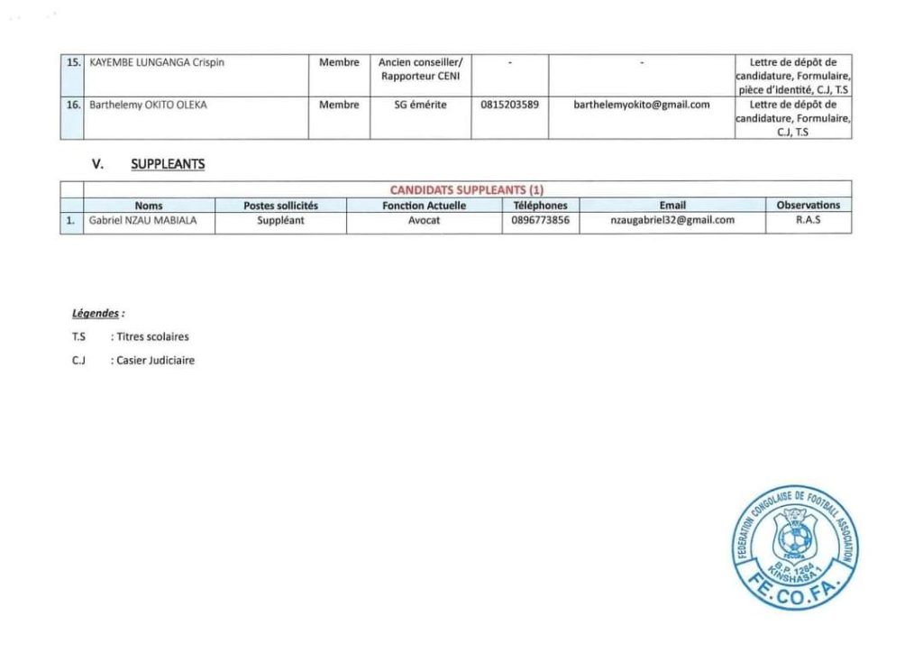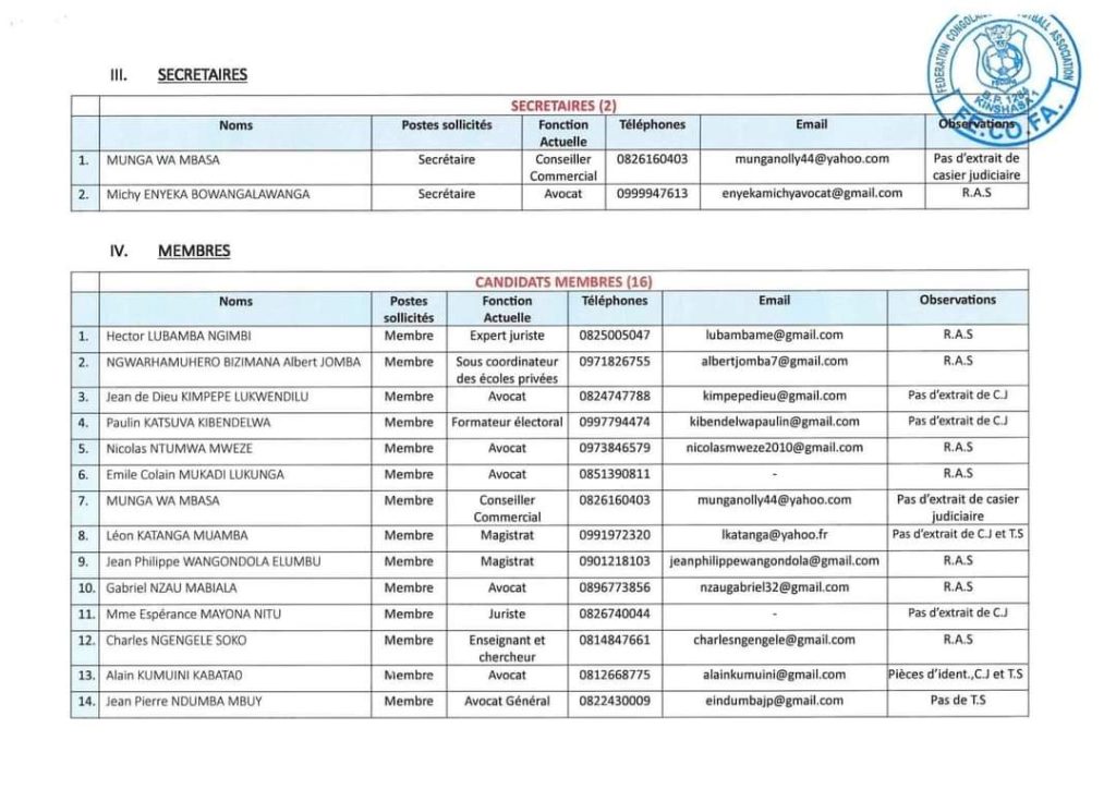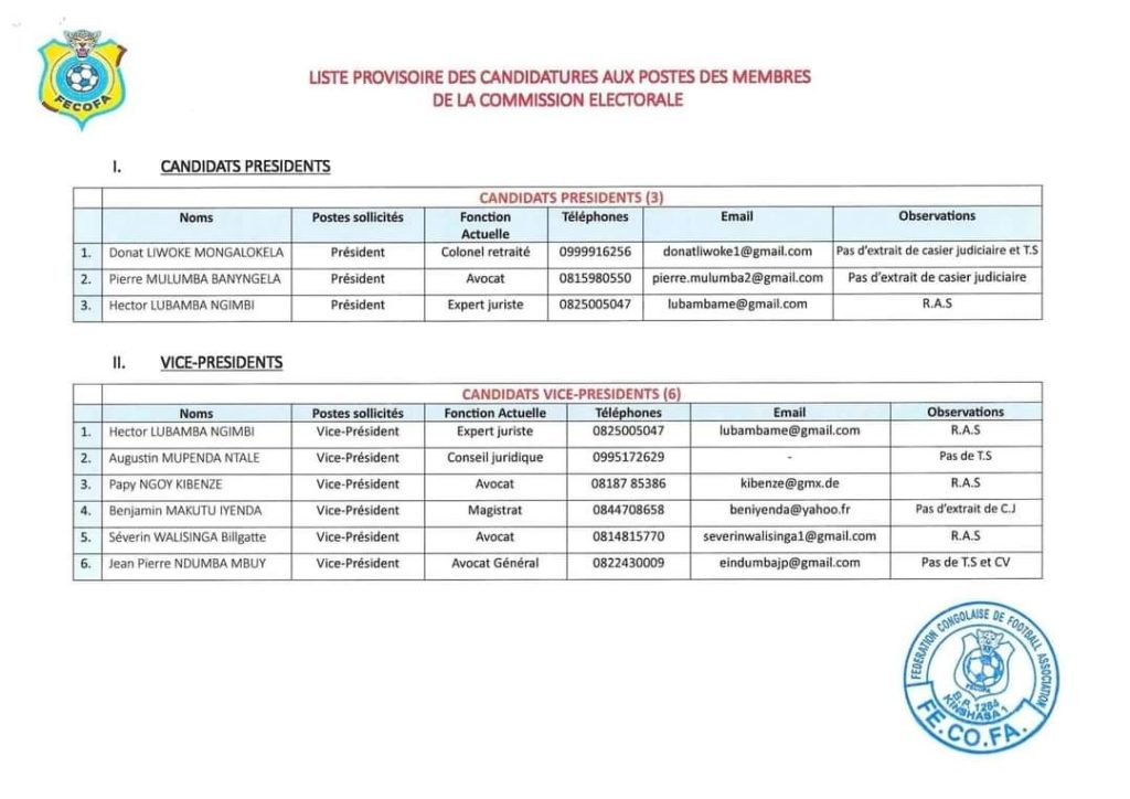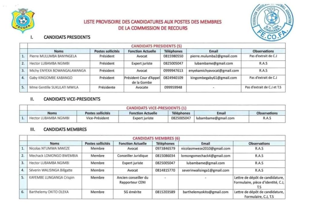 Entre-temps, le Comité de Normalisation (CONOR/FECOFA) a rendu publique la liste des personnes qui se sont porté candidates aux élections de la Commission électorale et de la Commission de recours.