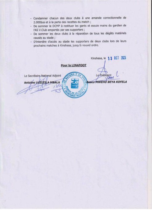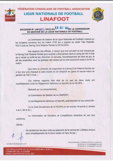Cette punition ressort du rapport des officiels de cette rencontre qui a informé que : “Tout est parti du but marqué par le DCMP qui a suscité un énervement dans le camp de l’AS V.Club qui a causé un arrêt de jeu d’environ 12 minutes, l’envahissement de l’aire de jeu, le jet des projectiles, avec au passage des casses qui se sont poursuivis aussi à la fin du match. ”, peut-on lire dans le communiqué rendu public par la FECOFA.