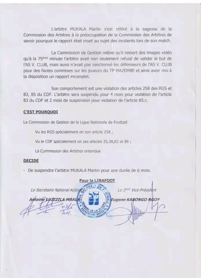 Malgré ses moyens de défense jugés insuffisants, la commission de gestion de la LINAFOOT a appliqué une suspension de 4 mois à Martin Mukala pour violation de l’article 83 du CDD et une suspension de 2 mois pour violation de l’article 85 c.