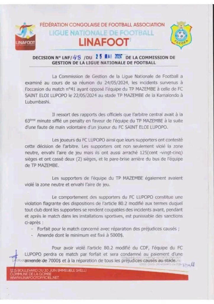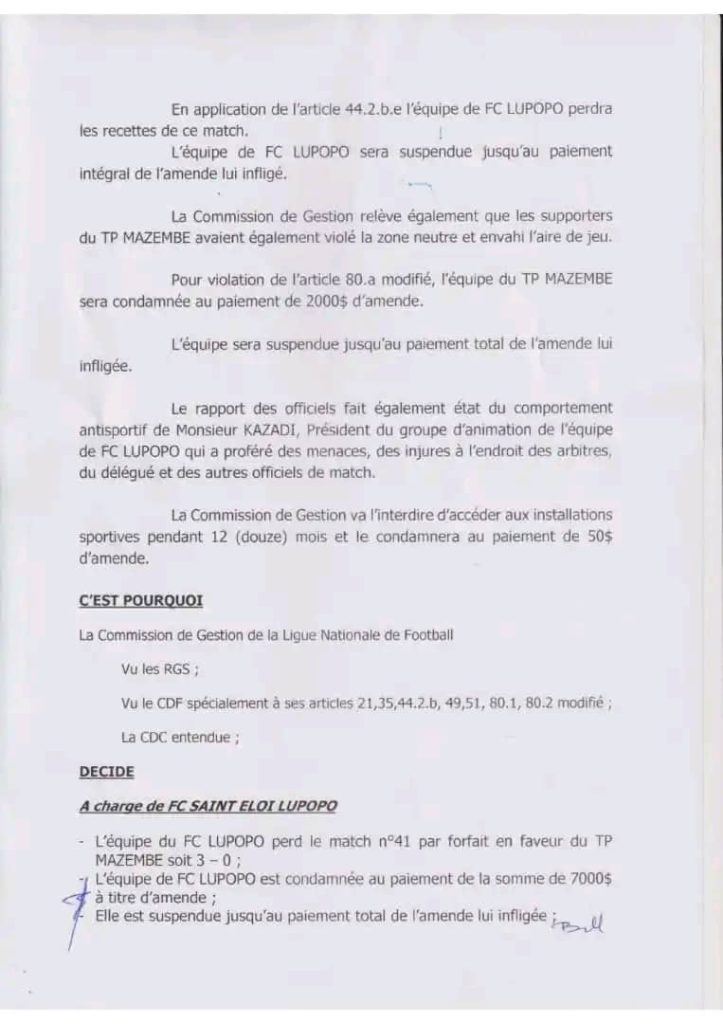 - Défaite par forfait : Le Saint Eloi Lupopo perd officiellement le match par forfait, avec obligation de réparer les préjudices causés au stade.