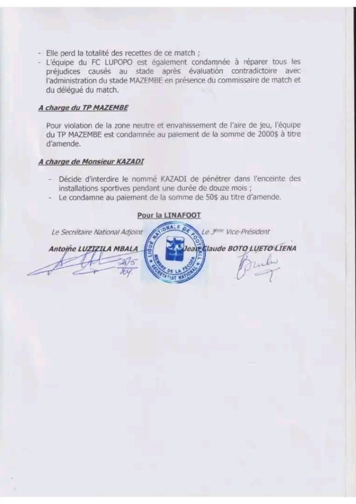 - Amende : Le TP Mazembe est condamné à une amende de 2 000 USD pour violation de la zone neutre par ses supporters, connus sous le nom de Badianguenas. Le club est suspendu jusqu’à la solvabilité de cette amende.